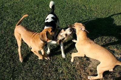 So Roscoe's roscaling has been officially curtailed. This means that he either gets tied, or kenneled (for now he is tied during the day––at night they are confined to our back porch). We will figure out a good compromise. One good thing about tying a dog, as much as I hate to do that, is that we will be pressed to walk them regularly. This is good for all of us.